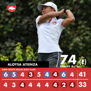 In the ladies’ event, SGA National Squad member Aloysa Atienza carded an even-par 74 after her second round. She has a total two-round of three-over par 150 which leaves her in Tied 36th with Australia’s Ella Scaysbrook and Kate Mcfarlane. SGA National Squad Player Inez Ng completed her round with a two-over par 76. Unfortunately, she missed the cut after a two-round total of +11.